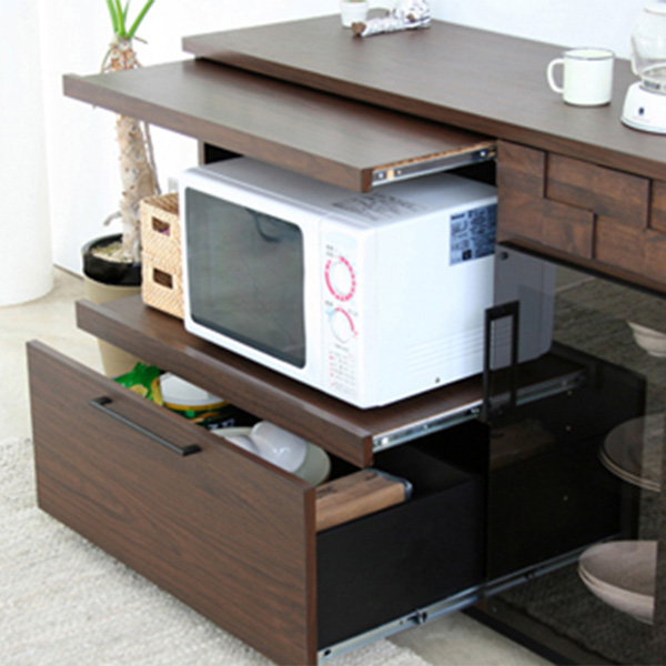スライド式のレンジ置きや隠し棚が、作業スペースを広げてくれるので、手の込んだ料理を作るときなどに便利です。
