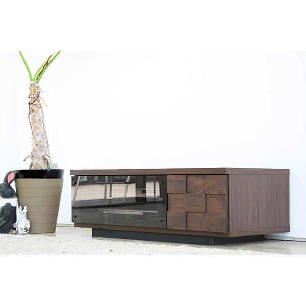 引き出し部分に装飾された凸凹タイルデザインと、スマートな見た目のブラックガラスの引き扉がスタイリッシュな印象を与えます。シンプルなデザインの家具とマッチします。