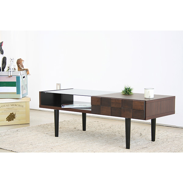 半分がブランの木目の天板、もう半分がブラックガラスになったデザインです。脚部分が細身になっていてスタイリッシュな印象です。シンプル柄の絨毯などにマッチします。