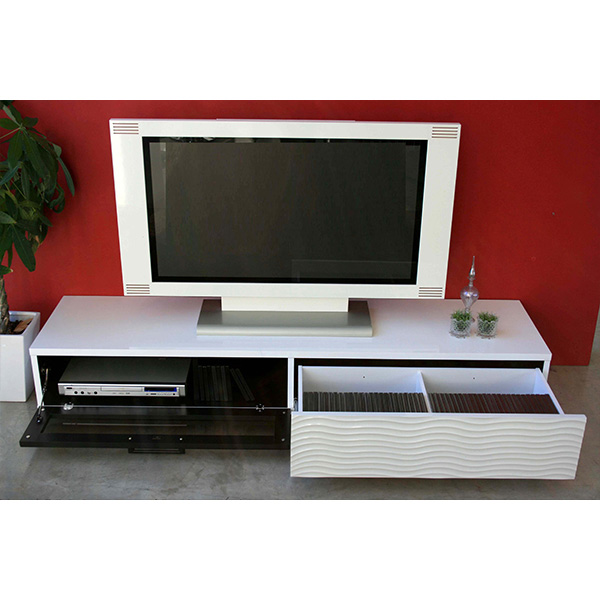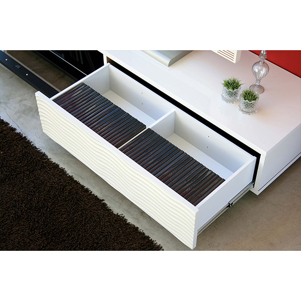 白い本体にブラックガラスのコントラストがスタイリッシュでしまった印象を与えます。引き出し部分には動きのある波状のデザインがされており、モダンなインテリア空間を構築出来ます。モダンな白や黒、原色系の鮮やかなカラーのインテリアにマッチします。