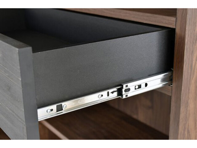 アカシア材を黒で塗装し、ワイピング加工を施した前板が特徴的なクイナシリーズのシェルフ。
