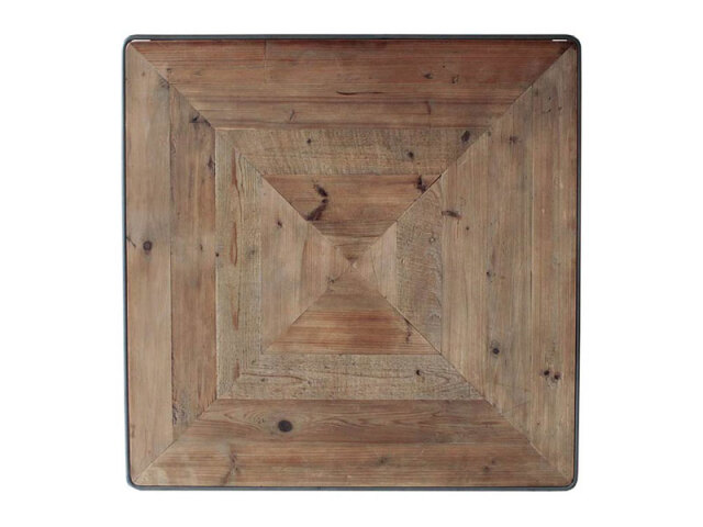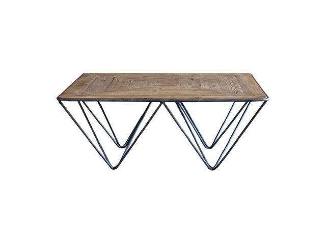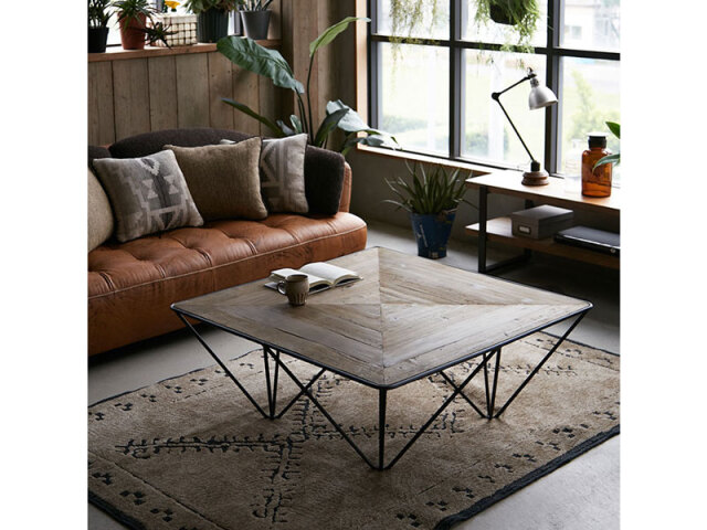 脚部の幾何学的なスチールフレームが目を引くコーヒーテーブルです。テーブルトップの木組みにもこだわりました。古材特有の質感とヴィンテージ加工を施したスチールフレームは重厚な雰囲気をつくります。