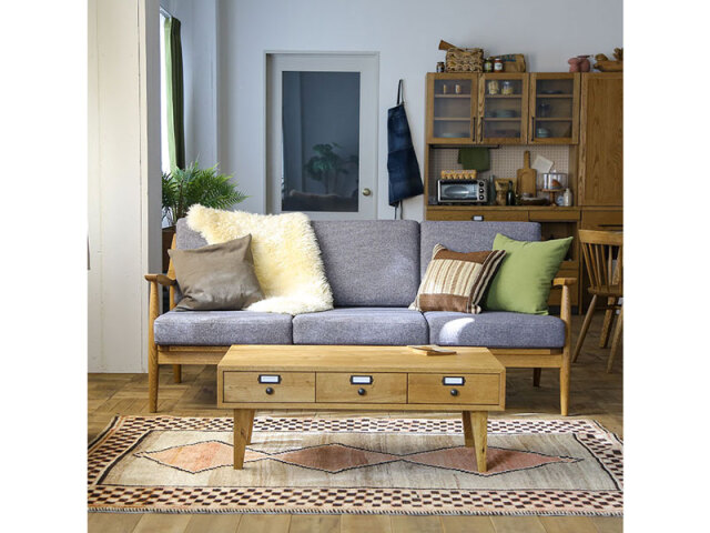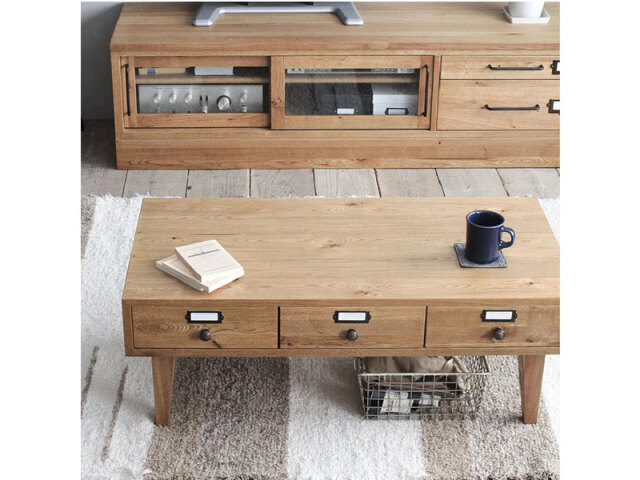 ナラ材ならではのナチュラルで温もりのある雰囲気はそのままに アンティーク感のあるスチールパーツを取り入れることでシンプル 過ぎず洗練された雰囲気に仕上げました。前後で異なる収納ス タイルを採用し、収納力もあるためリビングをすっきり演出するこ とも可能です。