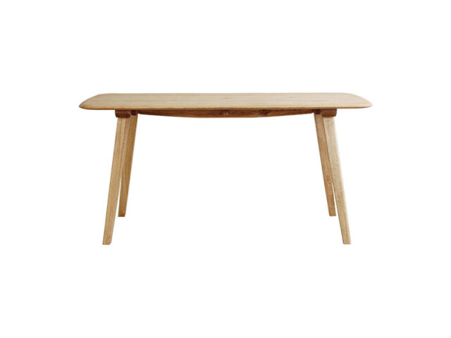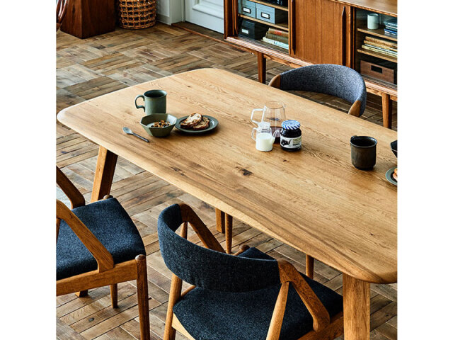 オイルで仕上げた温かみのあるナラ材を使用したシンプルなテーブルです。 天板の緩やかなカーブと面取りをこだわり、強弱の感じられる絶妙なバランスに仕上げました。