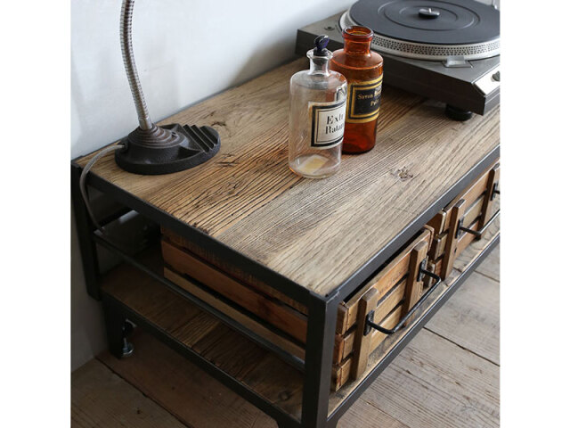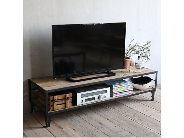 ハードな風合いの古材とアイアンフレームを組み合わせたテレビボードです。シンプルなカタチはより素材の無骨さを際立たせます。別売りのポコボックスシリーズと合わせて使いやすい内寸設計になっています。使用している古材は、独特の風合いを残すため、色ムラや釘跡、傷等を味わいとして残しています。同じものは一つとしてない、古材の個性をお楽しみください。