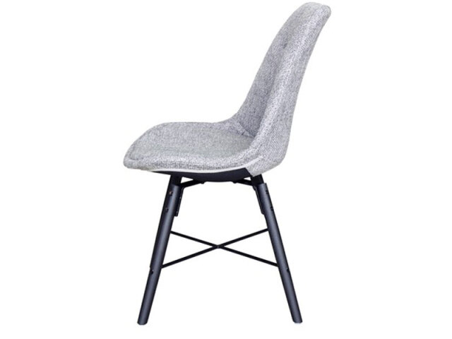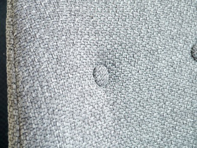 織り感のある生地を張り込み、背面にはボタン止めでアクセントを加えたダイニングチェア。 軽快なオーク無垢材の脚がポイント。