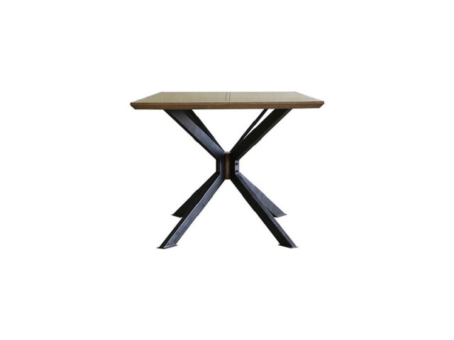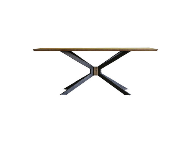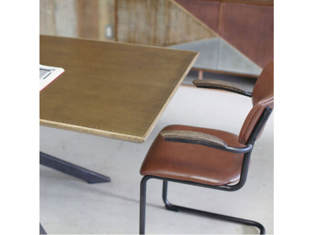 異素材が大胆にMIXされたインパクトのあるテーブルです。建築造形を彷彿とさせ る個性的なデザインの脚や天縁の鋲など、細部までこだわりに溢れています。