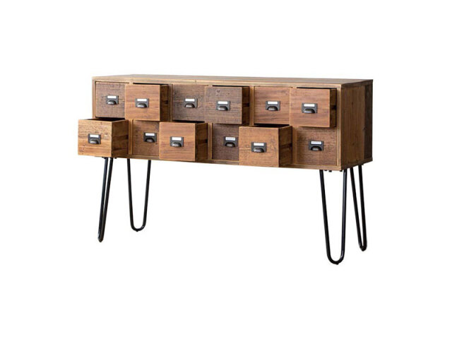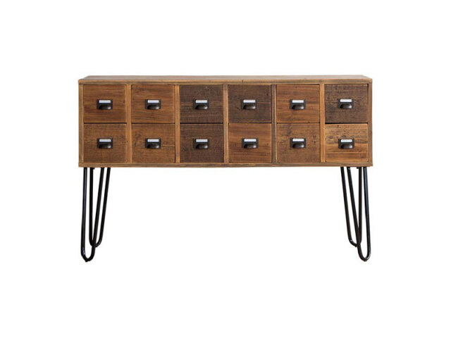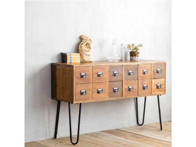 無骨な古材とスチールを組み合わせたインダストリアルなチェストです。天板 上はディスプレイスペースとしても使いやすい高さになっています。使用して いる古材は、独特の風合いを残すため、色ムラや釘跡、傷等を味わいとして 残しています。同じものは一つとしてない、古材の個性をお楽しみください。