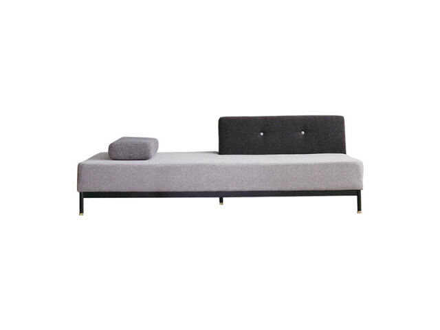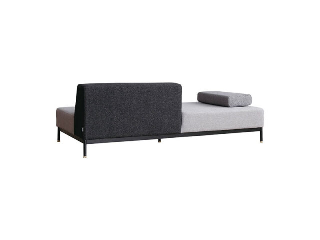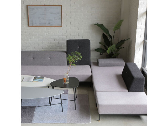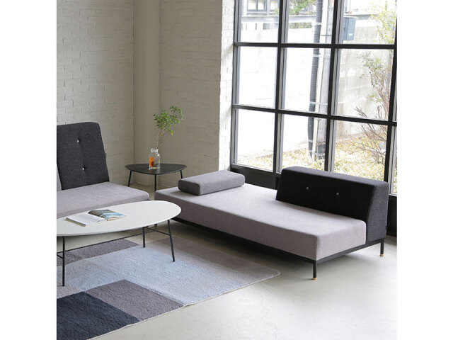 カラフルで可愛らしいファブリックの組み合わせと、機能性素材を使ったシックなモノトーンの2タイプをラインナップ。それらを引き締める黒の鉄脚+真鍮パーツ。アシンメトリーな形状と、色違いのクッションの組み合わせがユニークなロータイプソファです。テットシリーズ、オットマンを合わせるとさらに形のバリエーションが楽しめます。