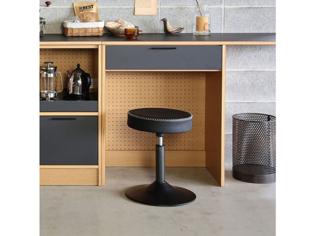 シンプルなフォルムと座面のステッチをアクセントに加えたスツール。マットブラックのスチールがモダンな雰囲気とさりげない存在感を醸し出します。キッチンのちょっとしたスペースにもすっきり収まるスマートなデザインで昇降機能は様々なシーンでの利便性を高めます。