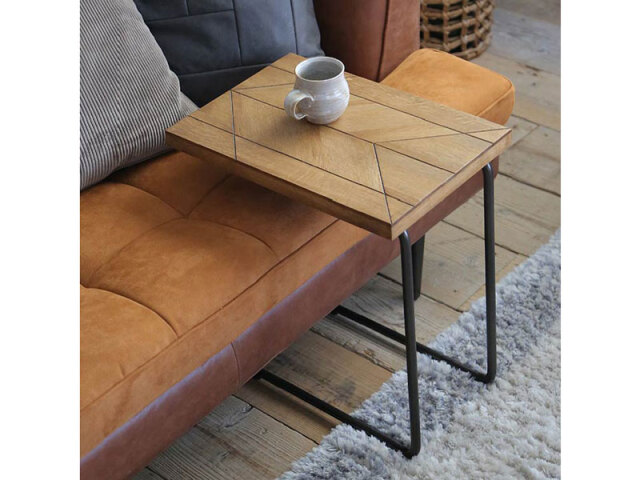 ユニークなコの字型のサイドテーブルです。ソファに挟んで使用していただくことができます。天板は凹凸のある無骨な古材と寄木した温かみのあるオーク材からお選びください。