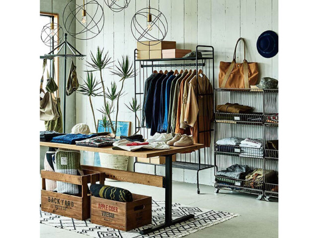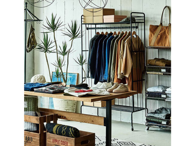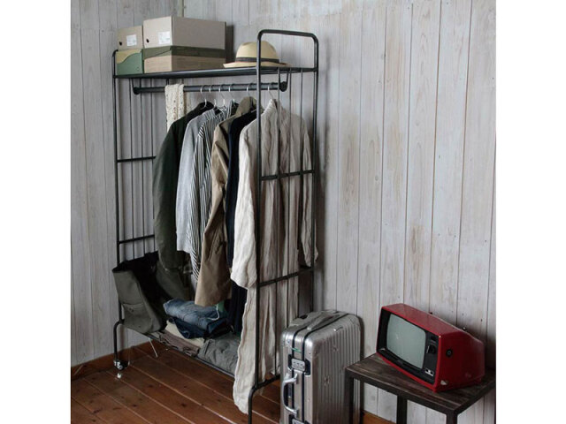 用途にあわせて脚パーツが選べるスチール製のハンガーラックです。細いパイプで組んだデザインはインダストリアルながらも圧迫感が少なく、すっきりとした収納をすることができます。