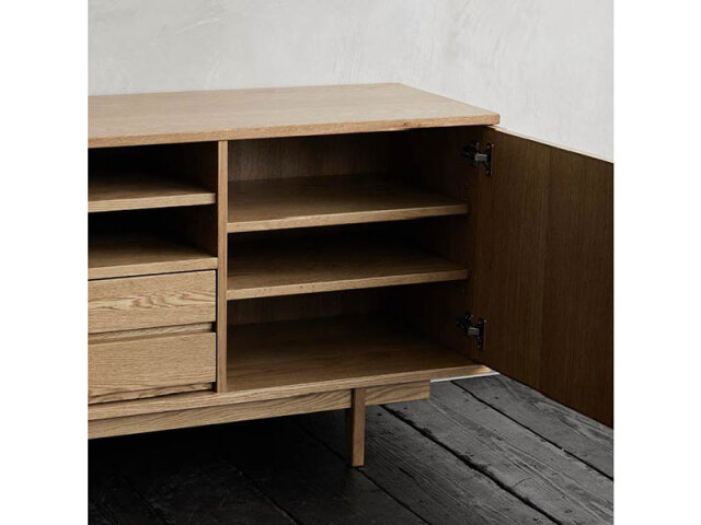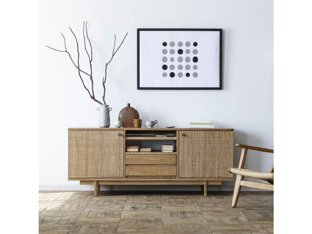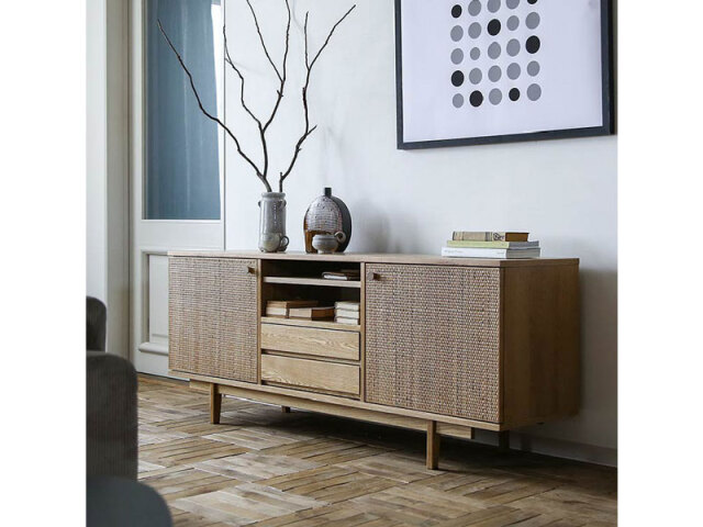 ラタン×木のナチュラルでラグジュアリーな雰囲気のサイドボードです。異 なる素材を使い、シンプルでお部屋に馴染みやすいデザインに仕上げま した。大きな扉内収納や引出し、オープンスペースなど、収納スペースも 多く、見せる・隠す収納ができるアイテムです。