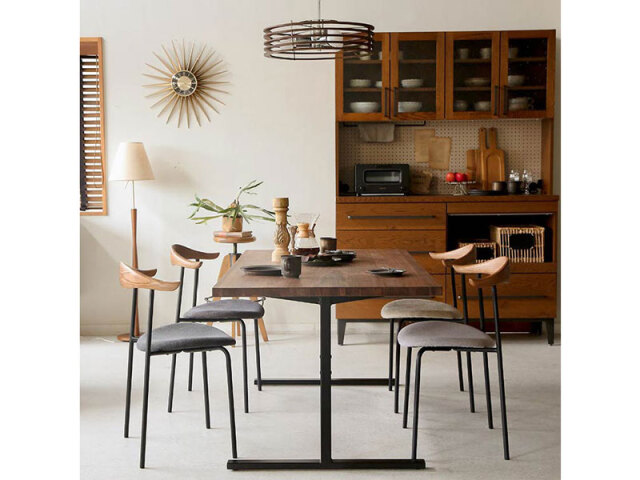 深みのある色合いのアッシュ材とファブリック、スチール脚と異素材を絶妙なバランスで組み合わせました。北欧スタイルのモダンなチェアです。張地は水分や汚れに強い機能性ファブリックで、ダイニングにうれしい仕様です。