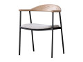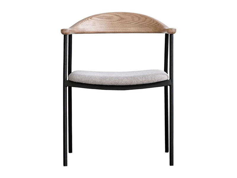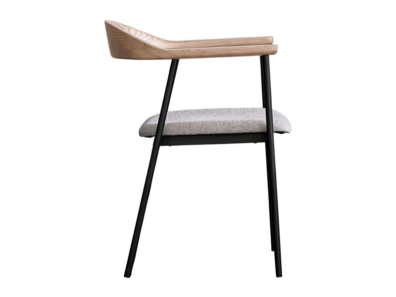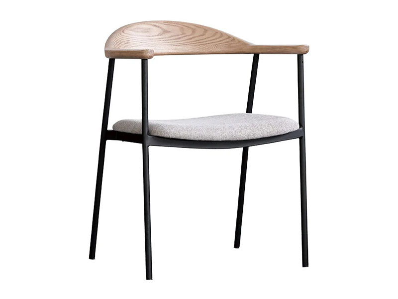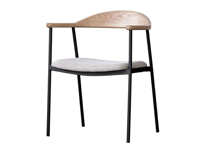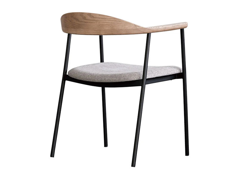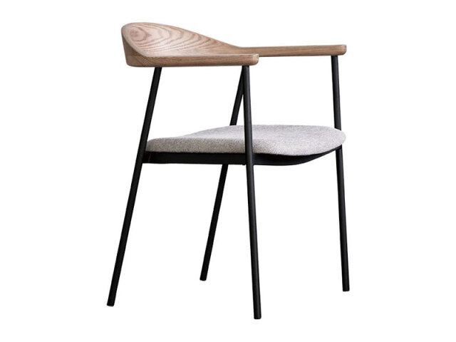 背から肘にかけてなめらかな曲線を描く木部と、スチールフレーム、ファブリックの異素材の組み合わせが個性的なチェア。無駄をそぎ落とし洗練されたフォルムに、優しい天然木の雰囲気が見事に調和しています。