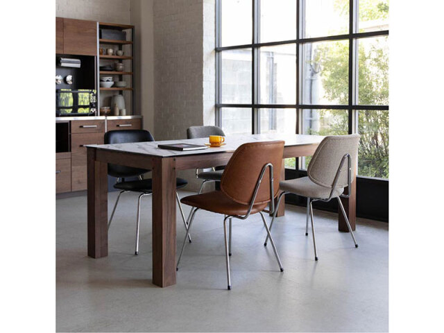 ミッドセンチュリーデザインをベースにしたチェア。当時をイメージしたレトロさとモダンな雰囲気を取り入れました。エッジの効いた脚と木製の肘置き、背のパイピングなど細部のディティールもこだわっています。背と座のシートが優しくしっかりとホールドしてくれる座り心地です。
