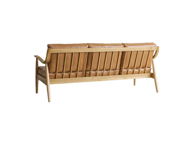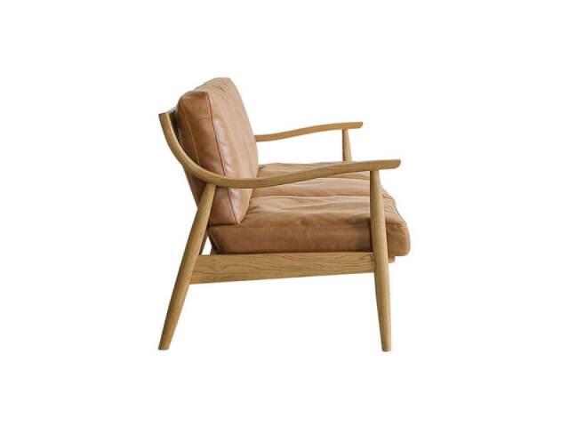 肘を置くと絶妙にフィットする曲線のアームが美しい木製ソファ です。肘を置いた時に絶妙にフィットするように設計しています。 F型モデルは通常仕様とは異なり、生地の厚みを活かしたダフ 感のある柔らかい座りが特徴です。