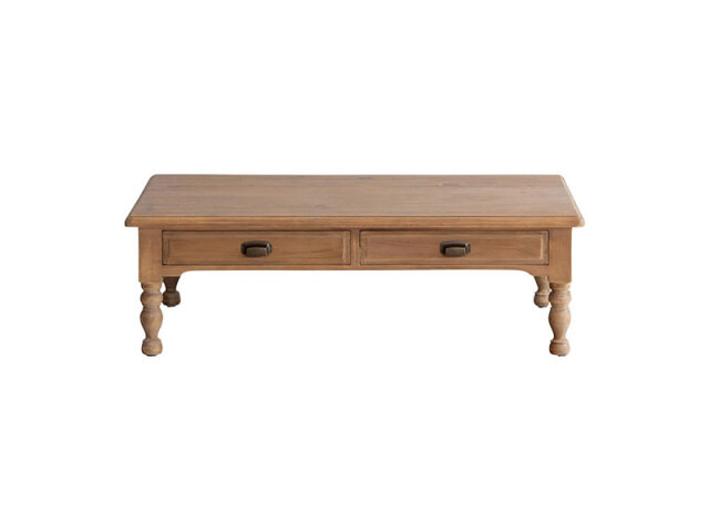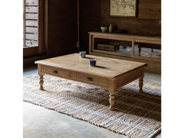 クラシカルなろくろ脚のデザインが特徴のコーヒーテーブルです。引出し付きなので、テーブル周りの雑貨をすっきりと収納することができます。使用している古材は、独特の風合いを残すため、色ムラや釘跡、傷等を味わいとして残しています。同じものは一つとしてない、古材の個性をお楽しみください。
