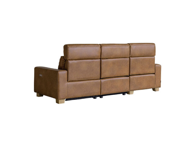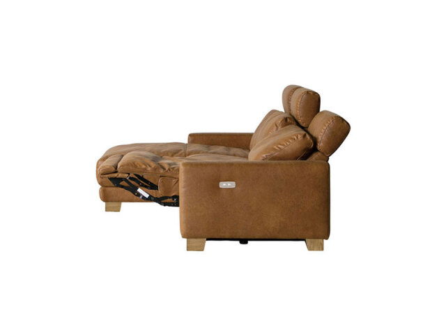 肘横のスイッチで座姿勢の切り替えができる電動リクライナーソファ。心地よく沈み込むフェザー入りクッションに全身をあずける、極上のリラックス感が味わえます。