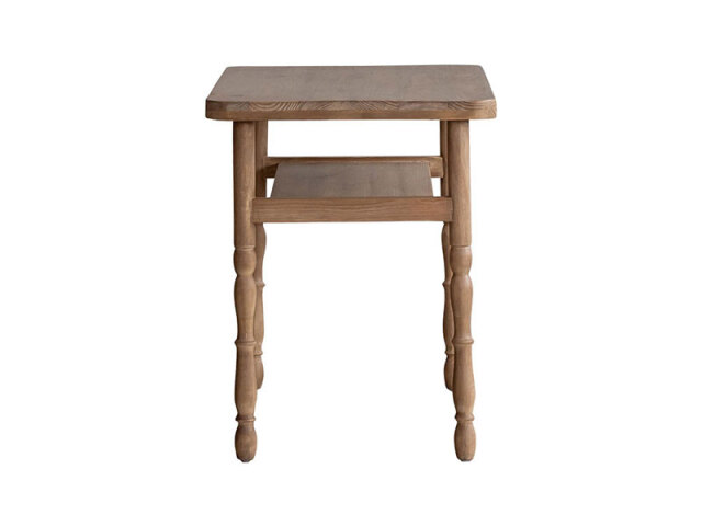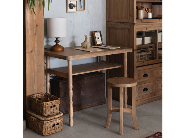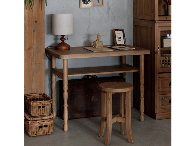 レトロで温かみのある、 どこか懐かしい雰囲気のデスク。 中棚にはちょっとした物を収納できます。 省スペースでコンパクトに収まるちょうどいいサイズです。