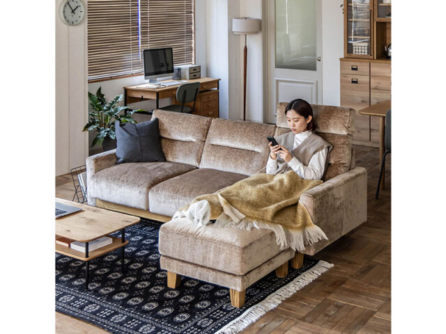 部屋の模様替えやシチュエーションに応じて柔軟に組み替えられるソファ。座面下の木部には2口コンセントがつき、スマホやタブレットを充電しながらくつろぐことが出来ます。柔らかすぎない硬さで、 リラックスしながら何時間でも過ごしたくなる座り心地です。