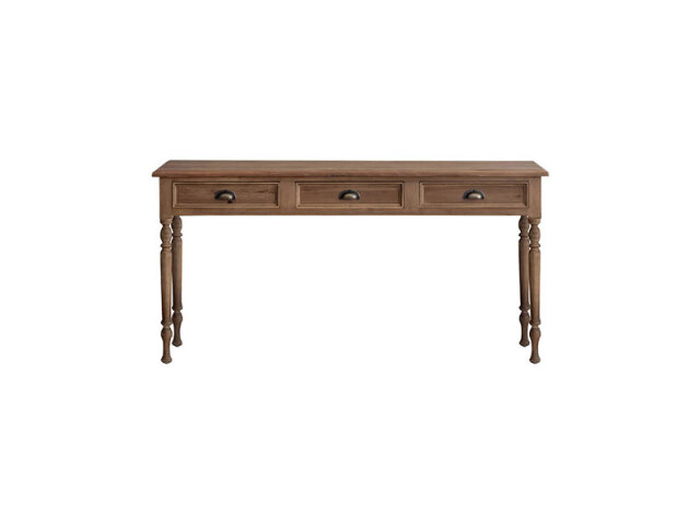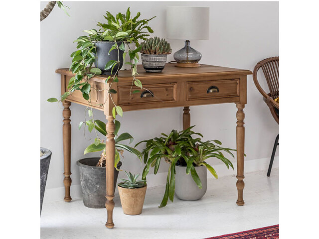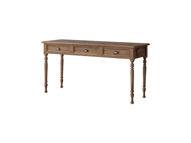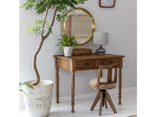 装飾的なろくろ脚が目を引く、 アンティーク調のデスク。 側面の掘り込みや取っ手パーツなど、細部までこだわり仕上げています。 引出しは奥行きが深く、 A3サイズもしっかり収納できる大きさです。 書き物をするデスクとしてだけでなく、 化粧台としてもご使用いただけます。