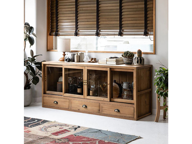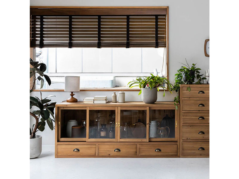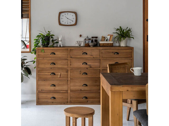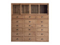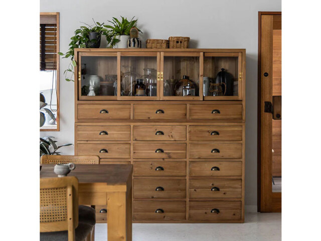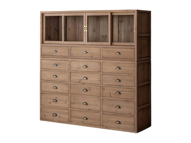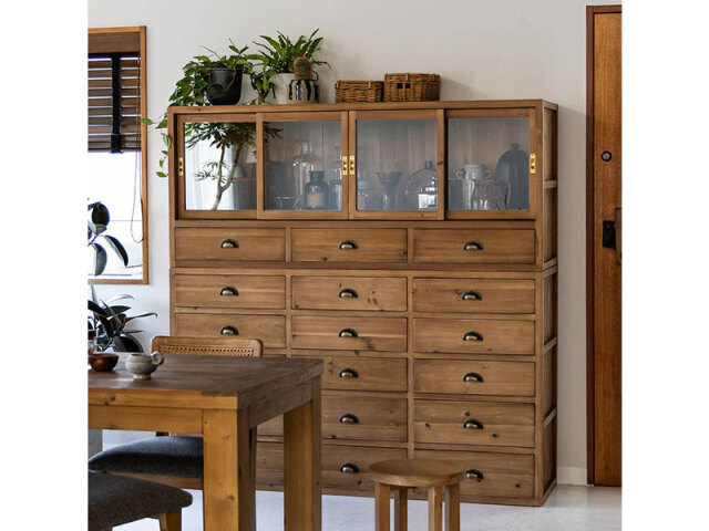 趣深い杉古材を使用し、昔の薬棚をモチーフにした小引き出しとガラス引き戸を組み合わせたチェストです。 上下セパレート式になっていますので、別々にご使用していただく事もでき、用途やお部屋の雰囲気に合わせて、自由にコーディネートをお楽しみいただけます。