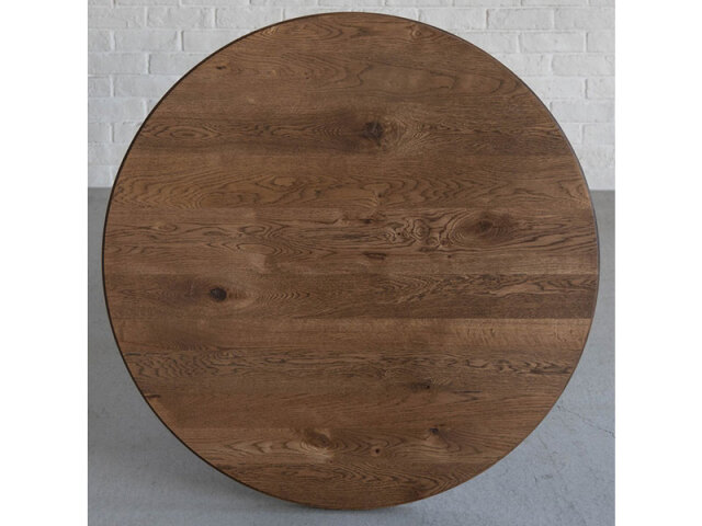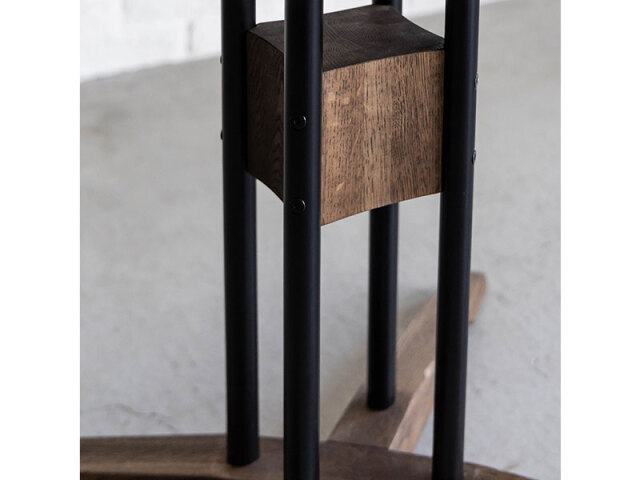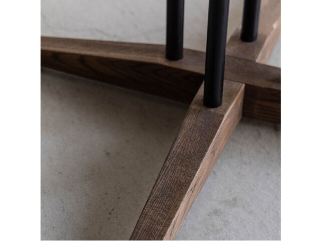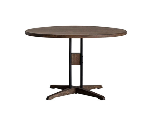 天板や脚部分の木部には木目を際立たせる塗装を施し、重厚感のあるヴィンテージな風合いに仕上げています。また、テーブル脚を木とスチール、異素材を組み合わせることによって素朴さを引き締め、スッキリした佇まいながら独特の存在感を演出します。
