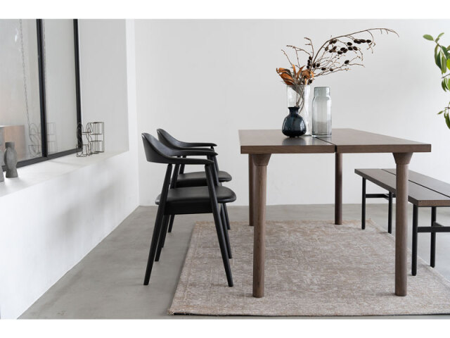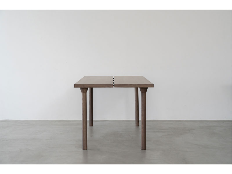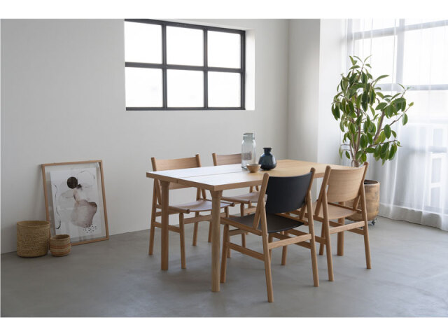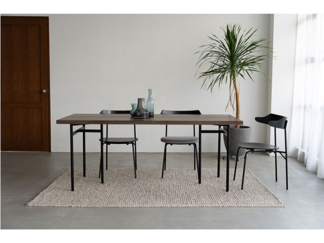 天板のスリットが特徴的なベーシックモダンなダイニングテーブル。 脚のデザインは木脚とスチール脚からセレクトできるので、お部屋のシーンに合わせた雰囲気に仕上がります。 カラーは自然で明るい印象のOAKと、落ち着いたトーンのGBRの2色展開で、様々なチェアや空間と合わせやすい色合いを選定しています。