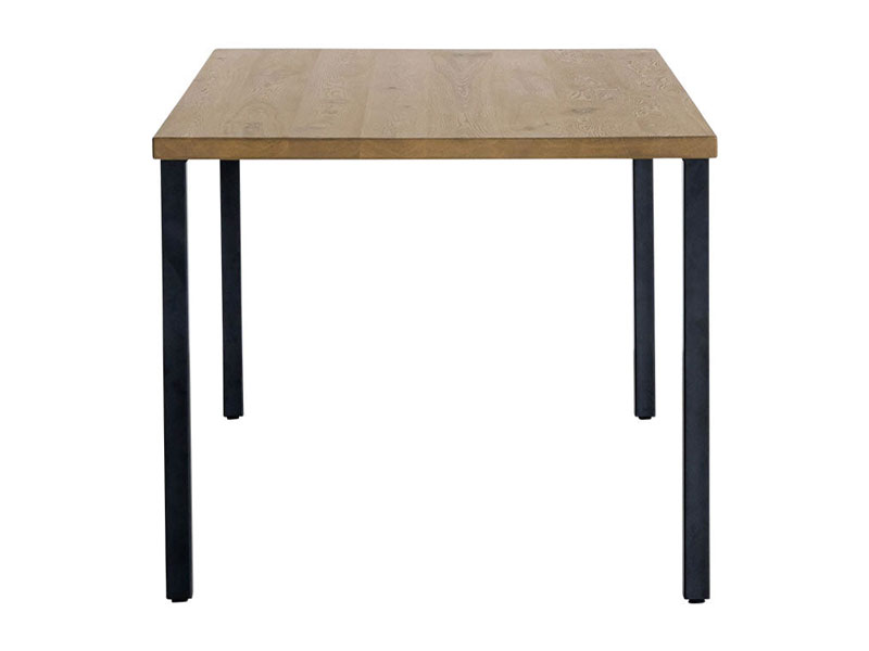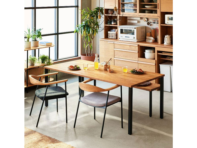 無垢材ならではの質感とナラ材のナチュラルで温もりのある風合いが際立つようにバランスを重視したシンプルなデザインに仕上げ、スチール脚を組み合わせました。どんな空間にも映え、優しくも洗練されたシリーズです。テイストを選ばないので、遊び心あるチェアとの組み合わせも楽しむことができます。