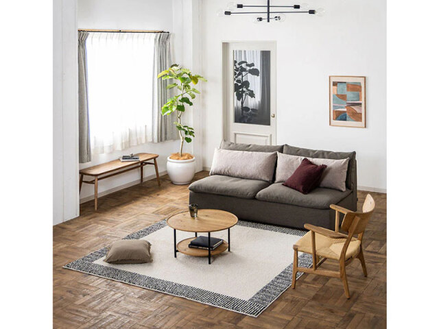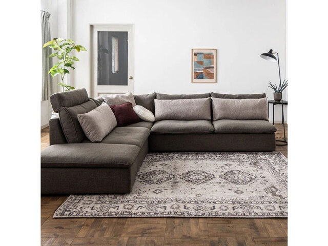 あぐらもかけるゆったりとした奥行きと、柔らかくもしっかりと身体を受け止める座り心地で、贅沢なくつろぎを感じられます。5サイズのラインナップを組み合わせるユニット式ソファで、間取りや生活スタイルに合わせた自由なレイアウトが可能。コントラクト利用も想定した丈夫な座面構造を採用しています。張地は水汚れに強いイージークリーン機能付きで、ペットボトルを再利用したエコロジカルなファブリックを使用しています。