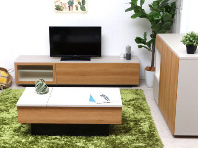 ナチュラルの木目とグレーの落ち着いた色合いがかわいいリビングシリーズ。 シンプルで余計なものが付いていないので、どこにでも馴染みやすいアイテムです。 収納力抜群なので、お部屋が綺麗に片付きます! 取っ手のないデザインはスッキリとした見た目と、日常生活で引っかかることがなく、 お子様のいるご家庭でも安心して使えます。 凹凸のガラスは中が見えにくくて便利! STLシリーズ リビングテーブル 180ローボード 120サイドボード