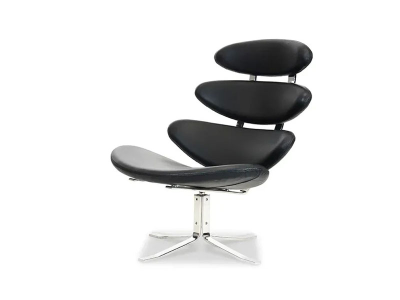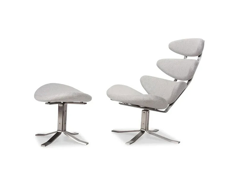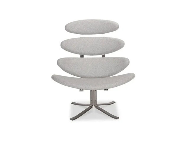 デンマーク出身のデザイナー、ポール・M・ヴォルザーにより1964年にデザインされたラウンジチェアとオットマンです。 デザインのヒントになったのは皆既日食。 月が太陽を覆い隠すと、そのまわりには太陽が放つ高温のガス、コロナが白い輝きとなって現れます。 このラウンジチェアはパーツが分かれており、隙間から漏れる光をコロナのように楽しむことができます。 時間の経過や季節の変化と共に表情が変わるラウンジチェアです。