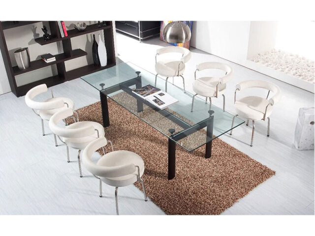 フランス人建築家によってデザインされた、家具の歴史の代名詞LCシリーズ。 4本の金属パイプの上に配されたボリュームのある座面は、回転する機能も与えられているので椅子を前後にひく事無く立ち居可能です。