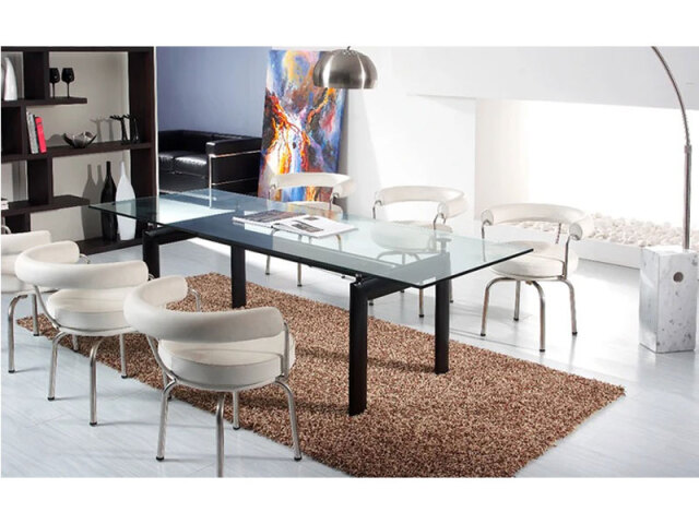 フランス人建築家によってデザインされた、家具の歴史の代名詞LCシリーズ。 4本の金属パイプの上に配されたボリュームのある座面は、回転する機能も与えられているので椅子を前後にひく事無く立ち居可能です。