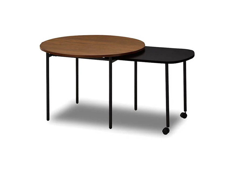 伸張式のダイニングテーブルです。 小ぶりな天然木の円卓から、ブラックのサブ天板を引き出すと、210cmの大きなテーブルとしても使用できます。 幅120cmとコンパクトながらも、隣同士にも座りやすいサイズです。 天然木の表情とブラックカラーのコントラストが美しいテーブルです。