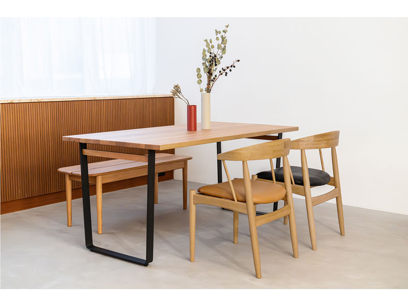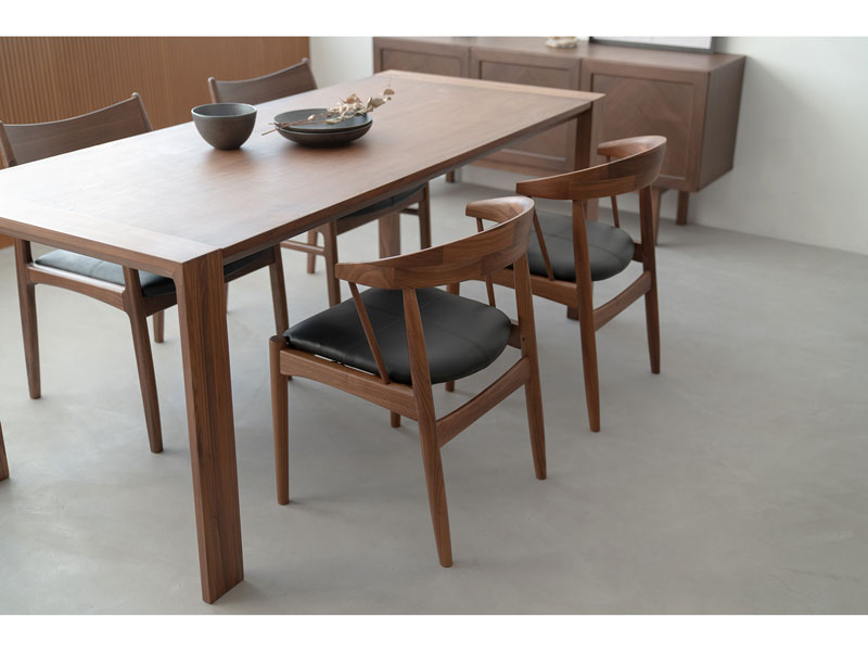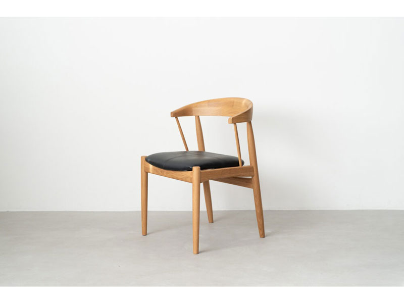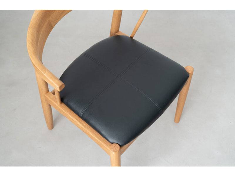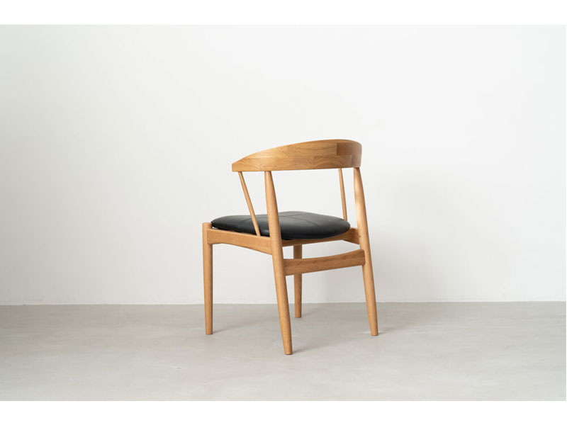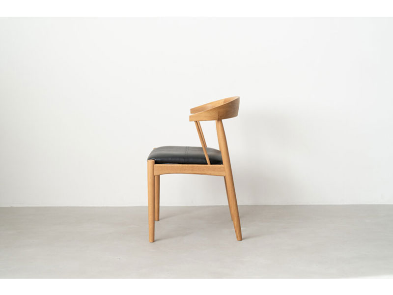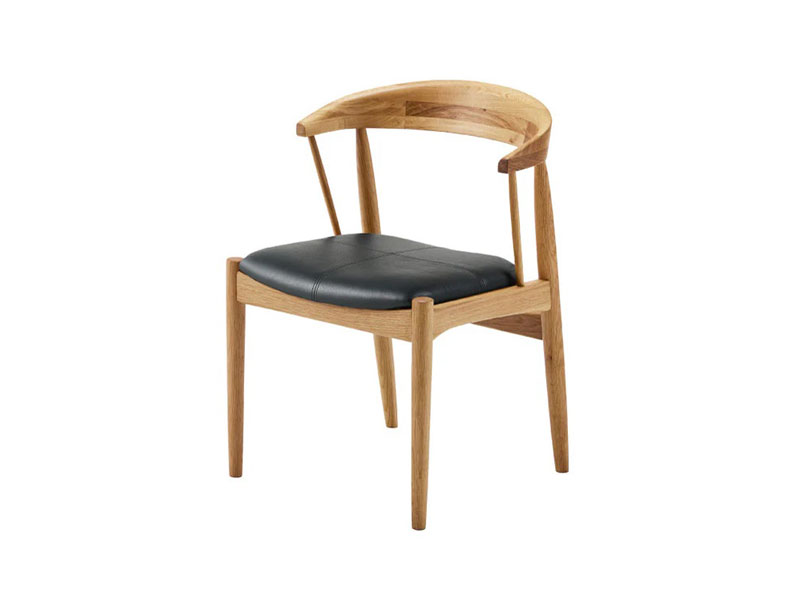 背もたれが優しくラウンドしたフォルムや、丸脚のダイニングチェアは、空間に柔らかな雰囲気をもたらしてくれます。 どの角度から見ても美しく見えるデザインです。 座面はお手入れがしやすいPU張地で、小さなお子様がいるご家庭のダイニングでも安心です。