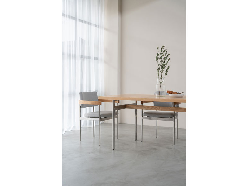 真っ直ぐに伸びた4本のステンレス脚・ 全体を包み込むようにカーブした木製のアーム・優しく湾曲したボリューム感のあるクッション素材感と質量感のバランスが シンプルでユニークなフォルムを生み出します。 背と座は、もっちりしたクッション性があり、 ゆったりとくつろげる掛け心地です。