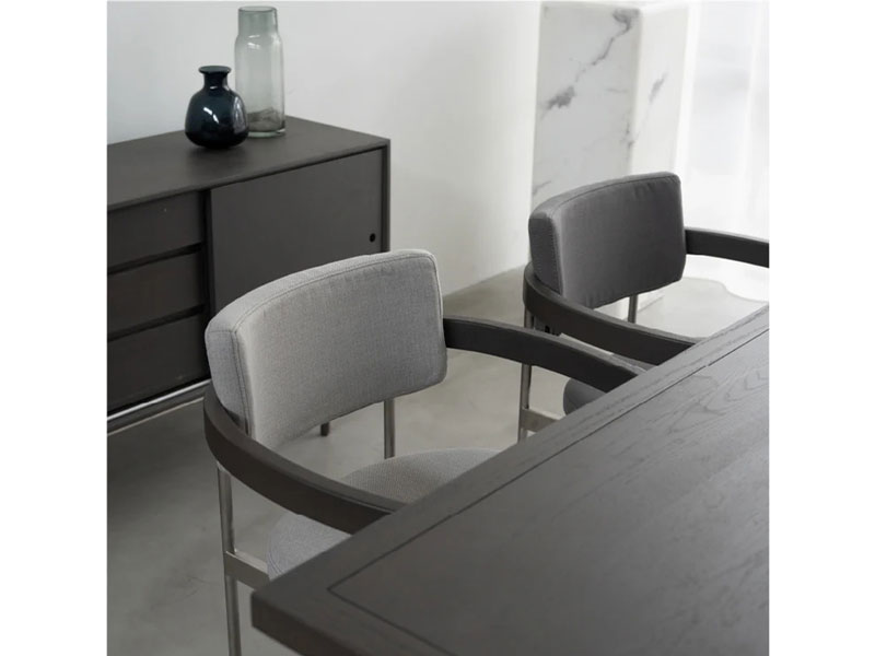 真っ直ぐに伸びた4本のステンレス脚・ 全体を包み込むようにカーブした木製のアーム・優しく湾曲したボリューム感のあるクッション素材感と質量感のバランスが シンプルでユニークなフォルムを生み出します。 背と座は、もっちりしたクッション性があり、 ゆったりとくつろげる掛け心地です。