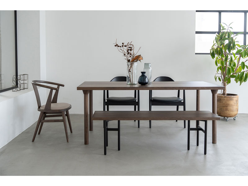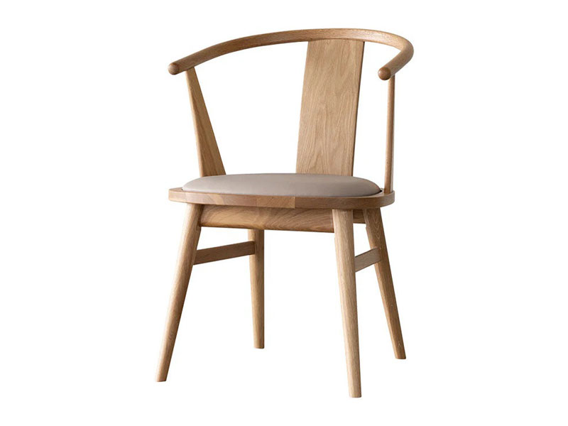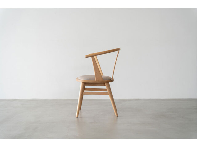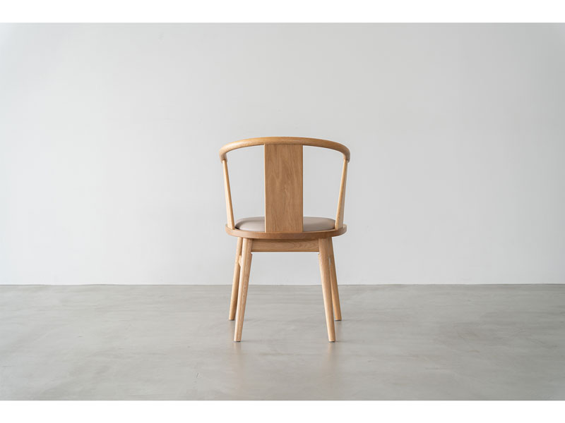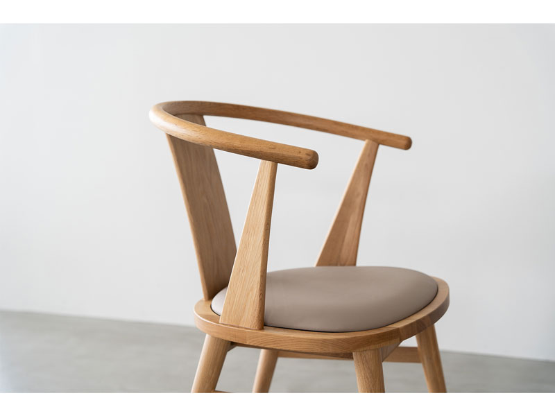背もたれが優しくラウンドしたフォルムや、丸脚のダイニングチェアは、空間に柔らかな雰囲気をもたらしてくれます。 どの角度から見ても美しく見えるデザインです。 座面はお手入れがしやすいPU張地で、小さなお子様がいるご家庭のダイニングでも安心です。