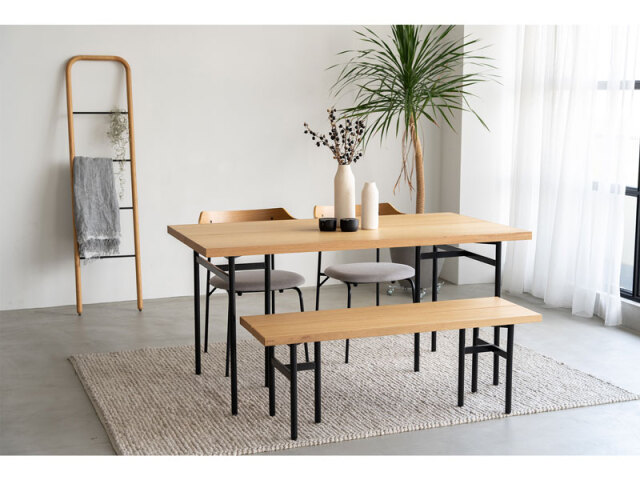 天板のスリットが特徴的なベーシックモダンなダイニングテーブルです。天然木材を使用しており、美しく温かみを感じさせます。脚のデザインは木脚とスチール脚からセレクトできるので、お部屋のシーンに合わせた雰囲気に仕上がります。 カラーは自然で明るい印象のオークと、落ち着いたトーンのグレーブラウンの2色展開です。