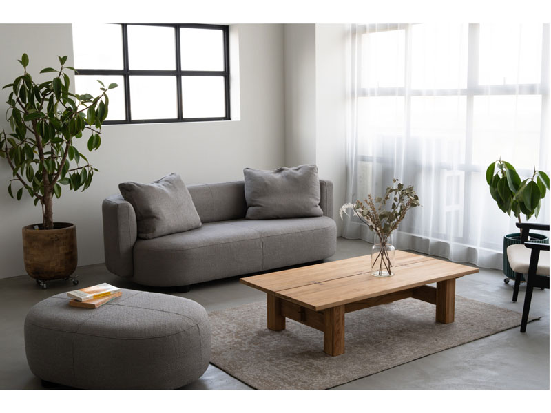 ラウンドしたフォルムが特徴のハーフアームソファ。丸みのある大きめのオットマンは、センターテーブルの代用や