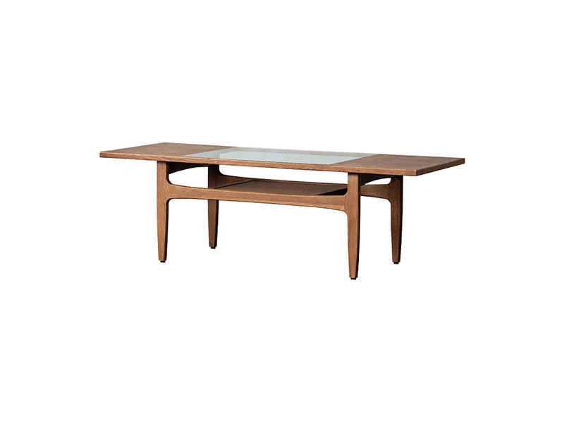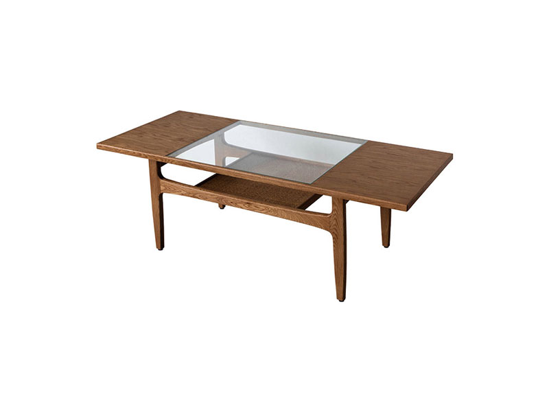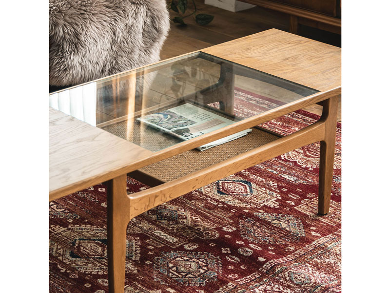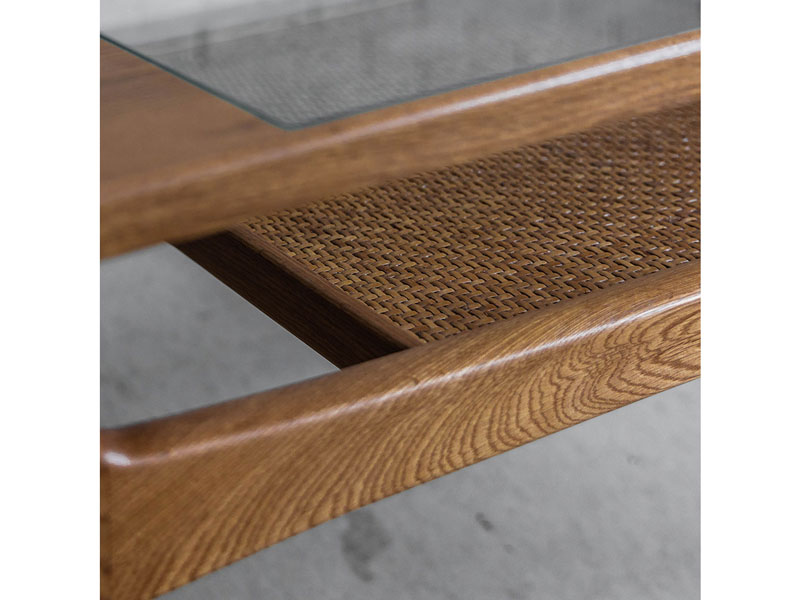 オーク材、 ガラス、 編み込みの籐を使用したエキゾチックなコーヒーテーブルです。 細部のデザインまでこだわり、すっきりと抜け感のある印象に仕上げました。