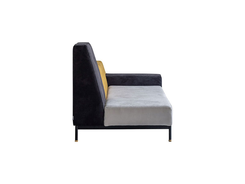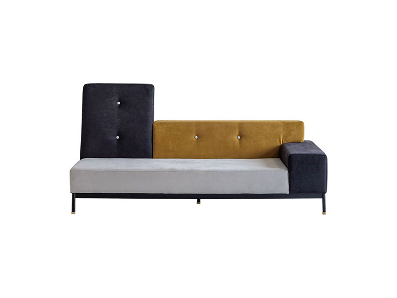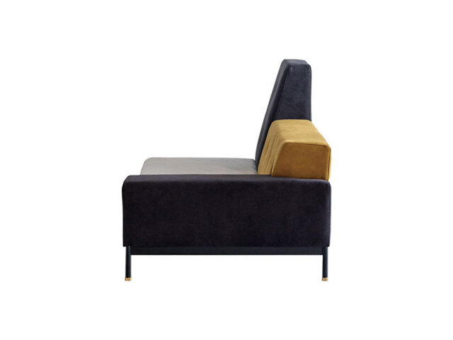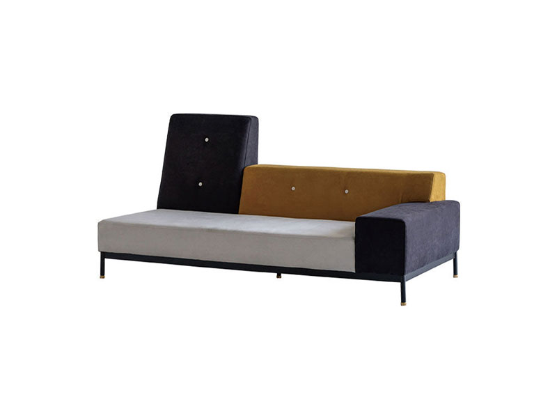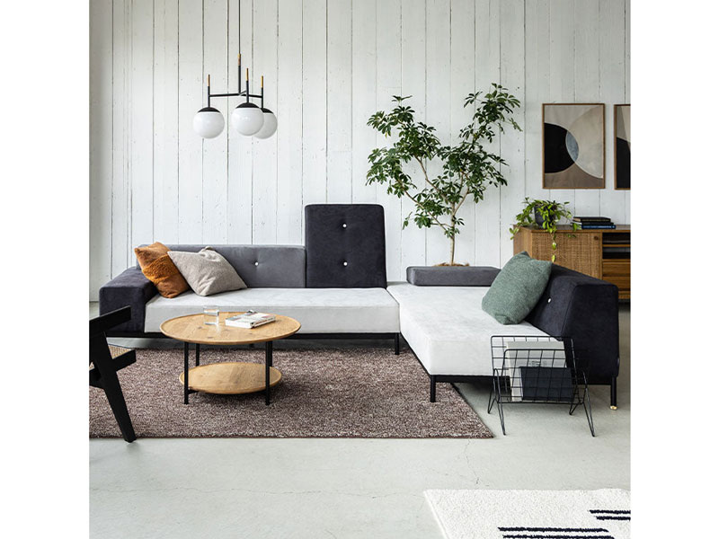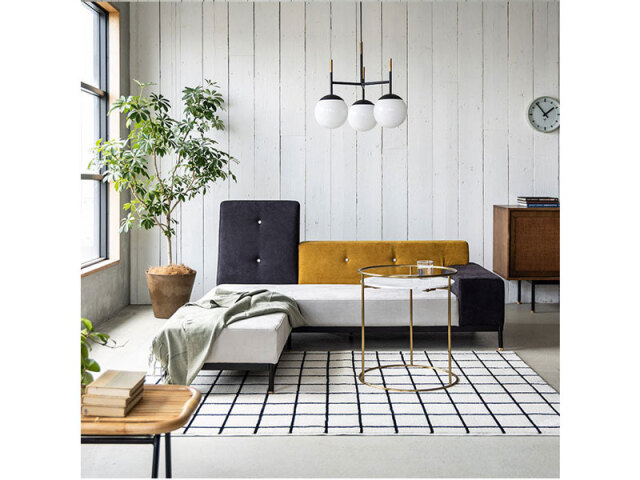 カラフルで可愛らしいファブリックの組み合わせと、機能性素材を使ったシックなモノトーンの2タイプをラインナップ。それらを引き締める黒の鉄脚+真鍮パーツ。アシンメトリーな形状と、色違いのクッションの組み合わせがユニークなロータイプソファです。テットシリーズ、オットマンを合わせるとさらに形のバリエーションが楽しめます。