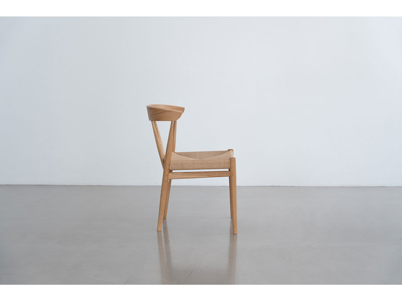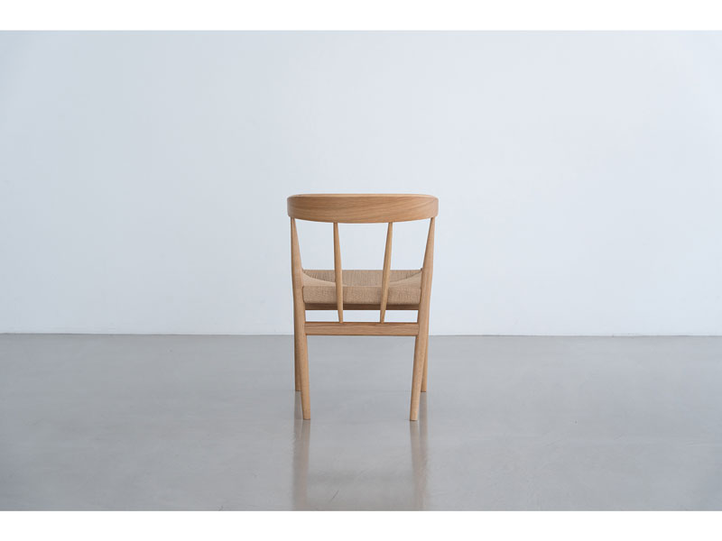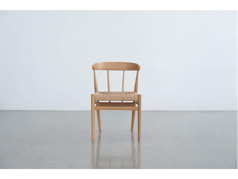 座面に編み込んだコットンベルトが特徴のチェア。楕円形状の脚部や、コットンベルトの織りや質感など、独自のディテールが詰め込まれています。