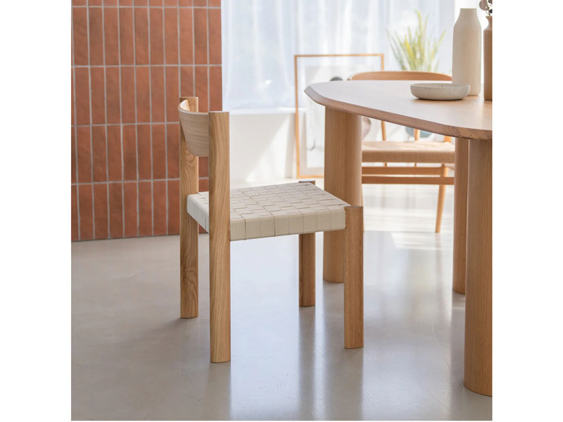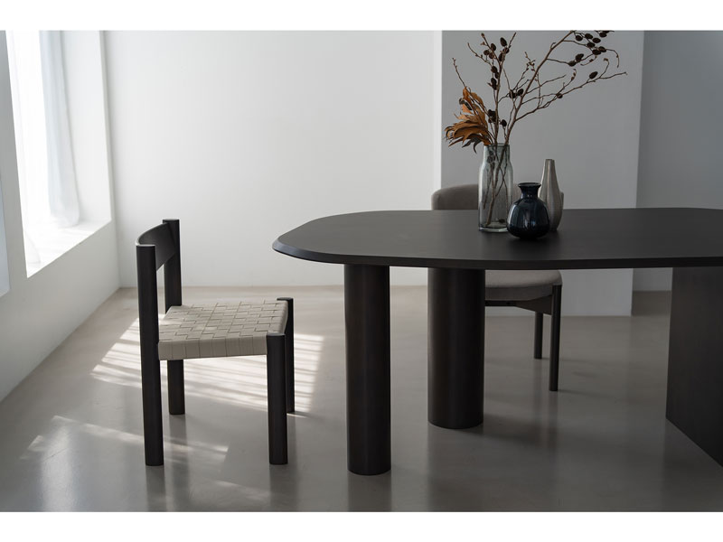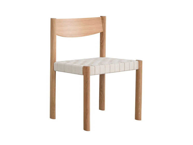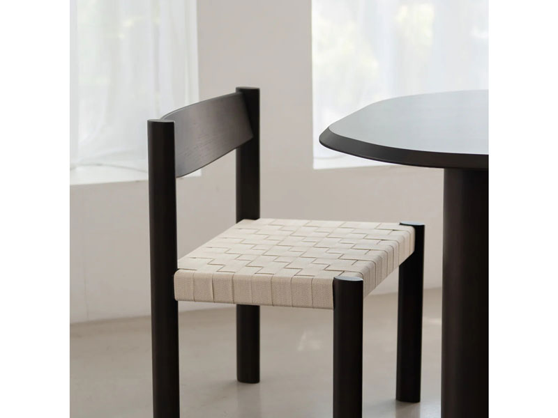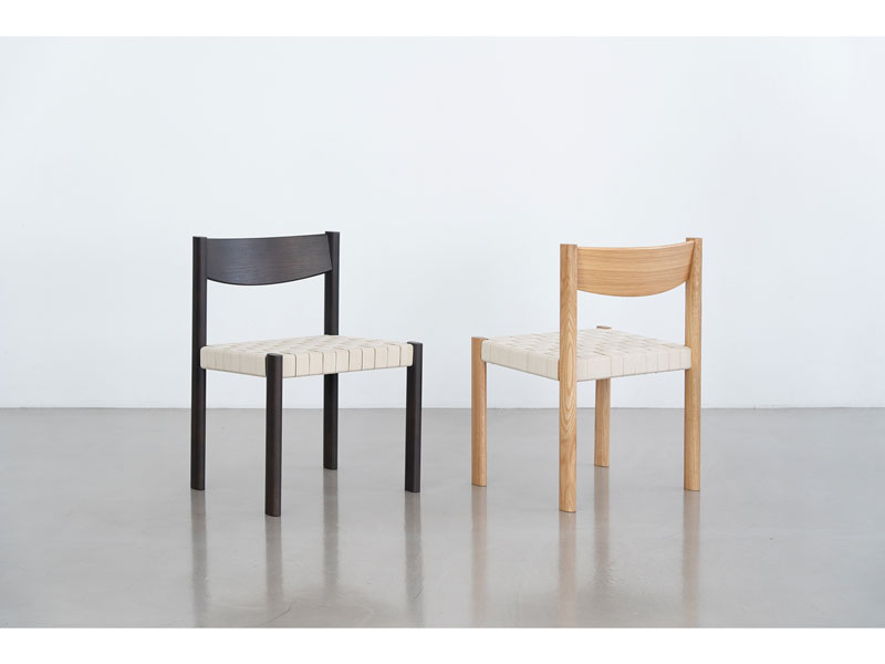 座面に編み込んだコットンベルトが特徴のチェア。楕円形状の脚部や、コットンベルトの織りや質感など、独自のディテールが詰め込まれています。