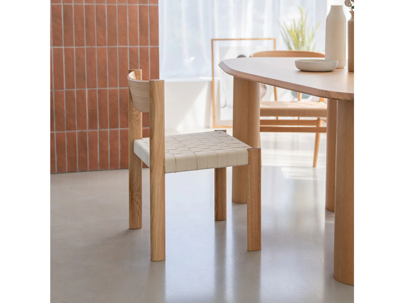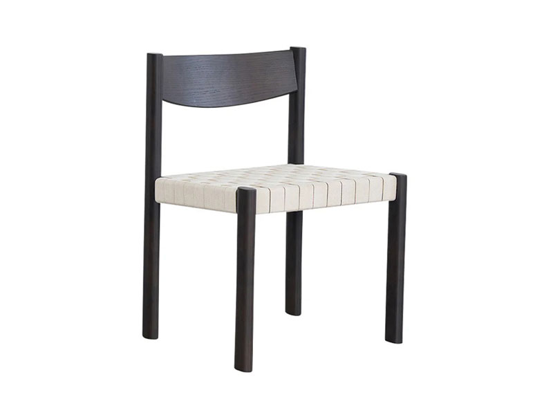 座面に編み込んだコットンベルトが特徴のチェア。楕円形状の脚部や、コットンベルトの織りや質感など、独自のディテールが詰め込まれています。