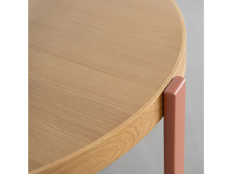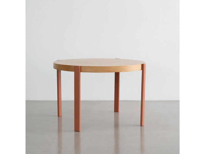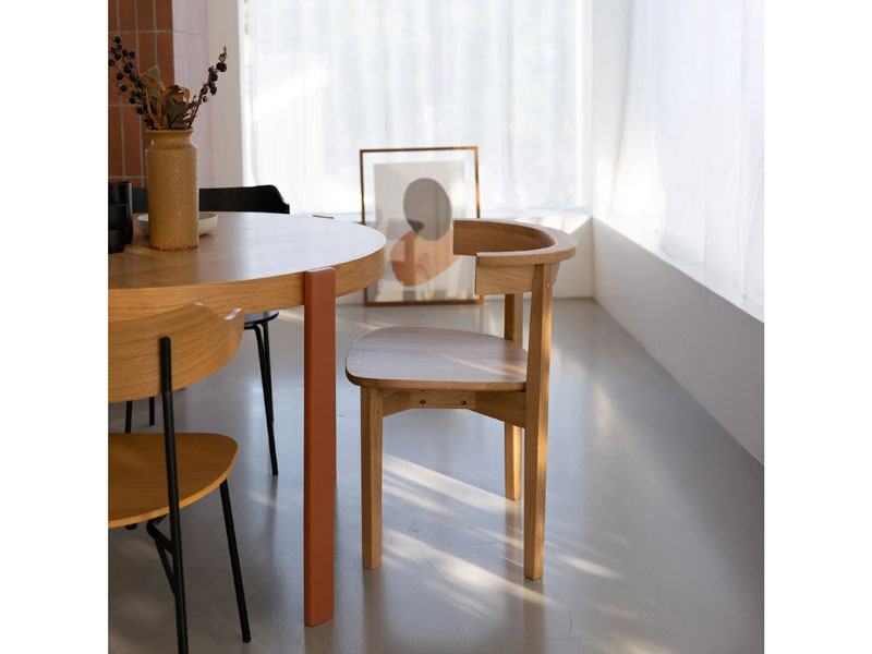 外側についたシンプルな脚が特徴の円形のダイニングテーブル。ブラックの脚は空間を引き締め、モダンでシックな雰囲気を演出します。