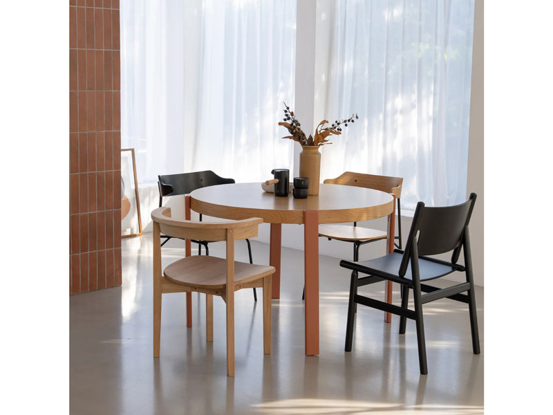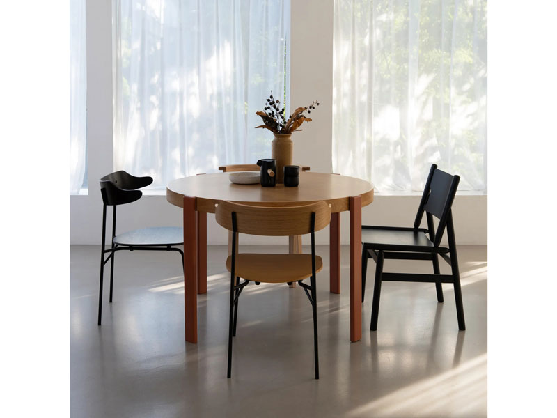 外側についたシンプルな脚が特徴の円形のダイニングテーブル。ナチュラルな明るさからモダンまで幅広いコーディネートに対応できます。